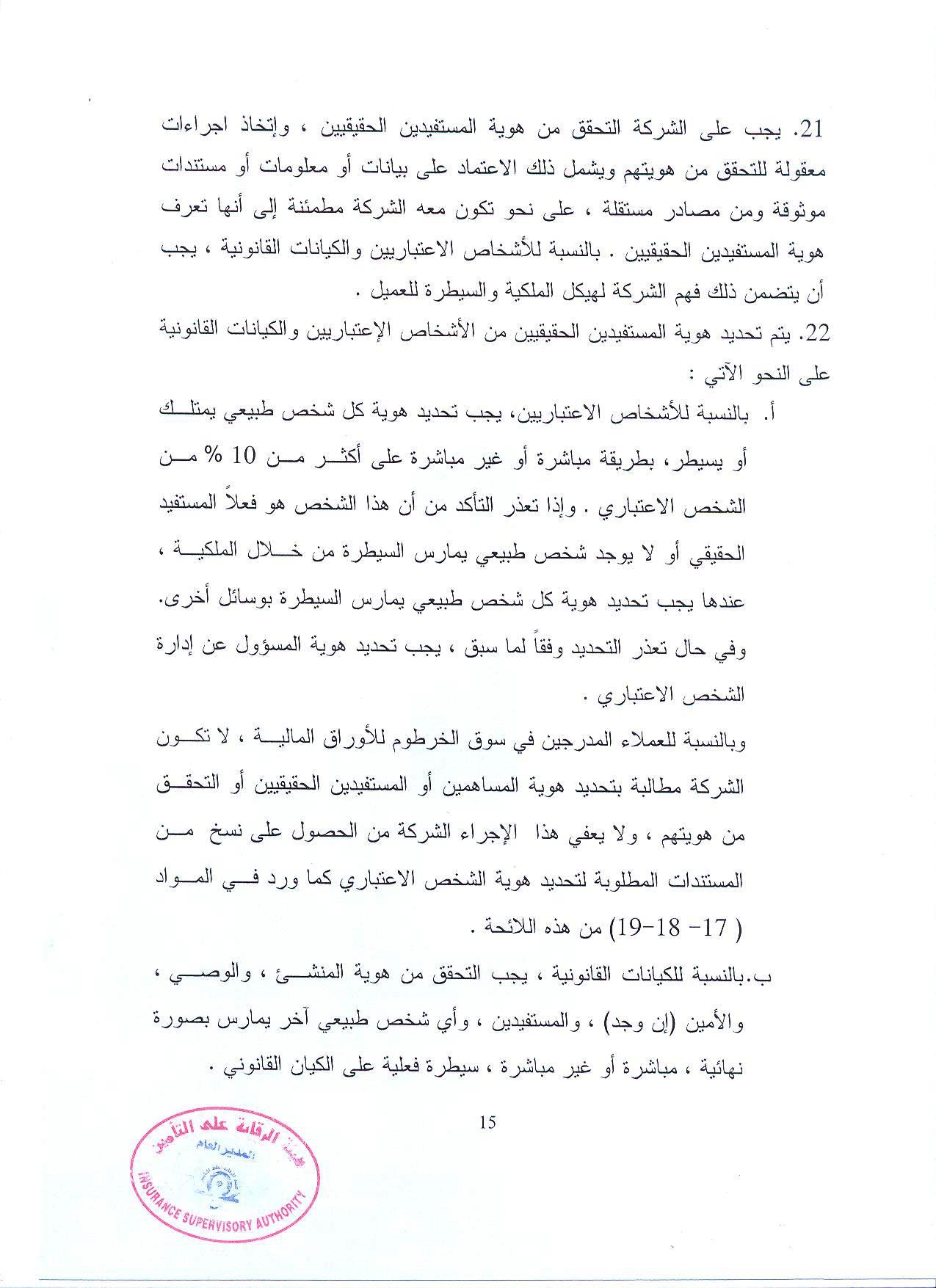 تهدف هذه السياسات للتأكد من إلتزام الشركة والعاملين بها بالضوابط واللوائح والمبادئ المتعلقة بمجال مكافحة غسل الأموال وتمويل الإرهاب الواردة في :